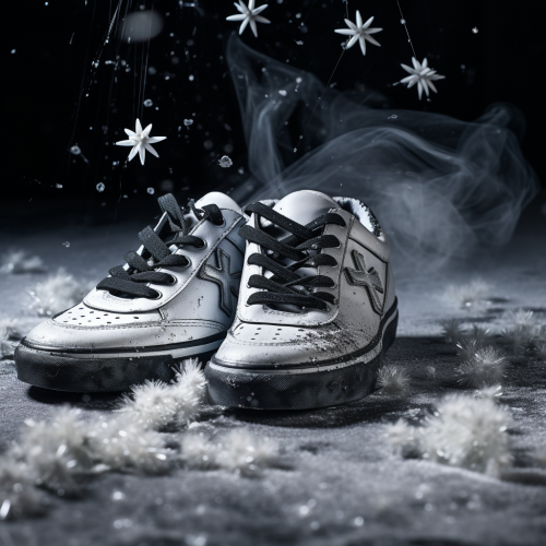 a few frosty white snowflakes on top of a pair of black dance shoes. They are sitting on a gray granite slab. nothing the the background.