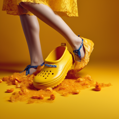 a magazine print advertising with a snif in part that are for a fashion brand based on velveeta cheese and yellow crocs shoes, portrait realistic like a fashion campaign --v 6.0 --ar 9:16 --s 750