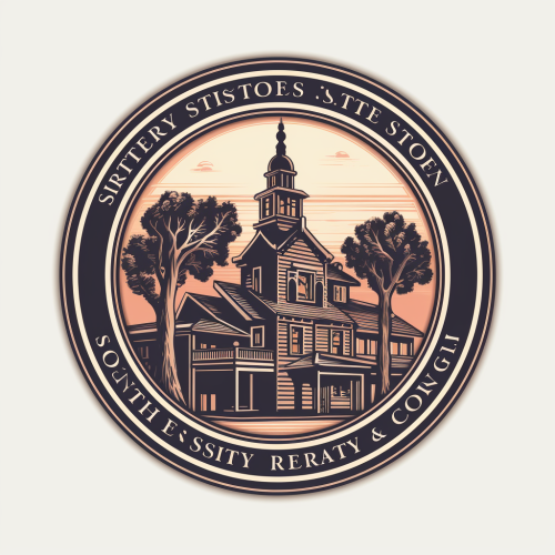 a logo for a historic preservation society. It is round, bordered by steel tubes. The prominent image is of a 1890s Queen Anne Victorian home still elevated from the street with large trees in the front. Behind the house is the silhouette of a steel mill. There is a scroll across the bottom. Photo realistic, with sharp focus and highlights