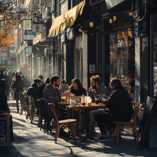 people chatting and drinking coffee at cafe tables in Shoreditch, the cafe tables are outside cafes, it is a sunny day, photorealistic, hyper detailed, taken with a Nikon D70, 8k