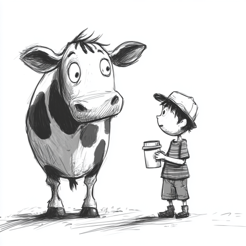 cow talking to farmer. The farmer is holding a coffee mug and empty milk carton upside down. A minimalist comic-style child's drawing in black and white with simple line art. The drawing is primitive and lacks any background or shadows, onli contour. The overall composition is clean and uncluttered.