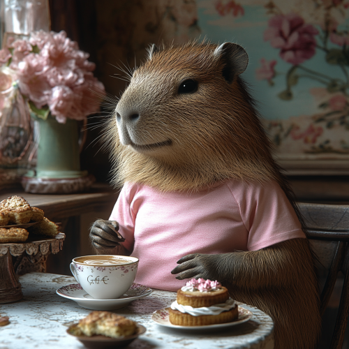 32k photo happy capybara in a pink t-shirt drinking coffee with cakes in a cafe at a white table, smiling, vibrant, bright colors, advertising photo --s 750