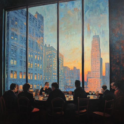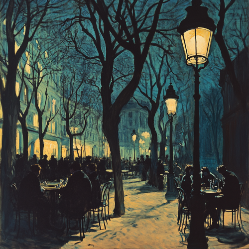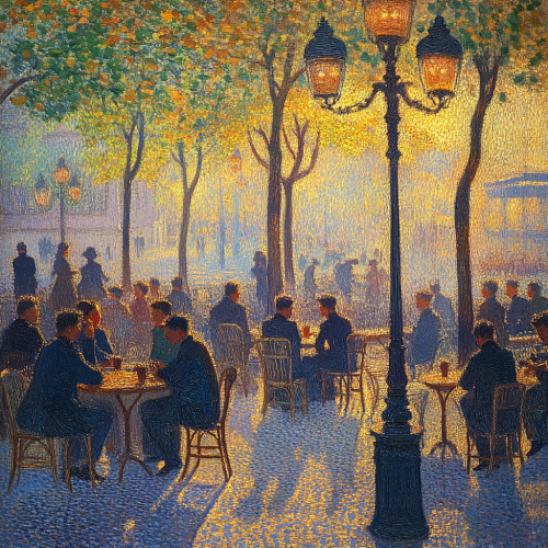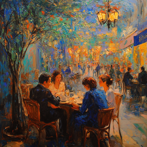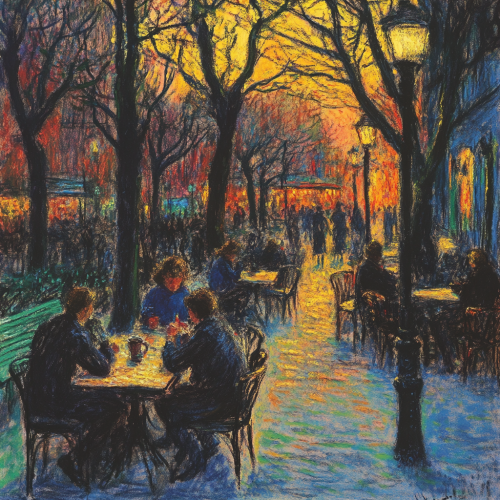 Pintura impressionista pastel e grafite de Monet numa cena em New York, zona rural em um final de tarde, pessoas em mesas conversando e tomando cafe. . Tinta encáustica a óleo, azul e neon fluo in terracota e verde cana. linogravura tuequesa elétrica. árvores secas com galhos longos e secos. sombras das pessoas no chão são compridas. postes de luz antigo