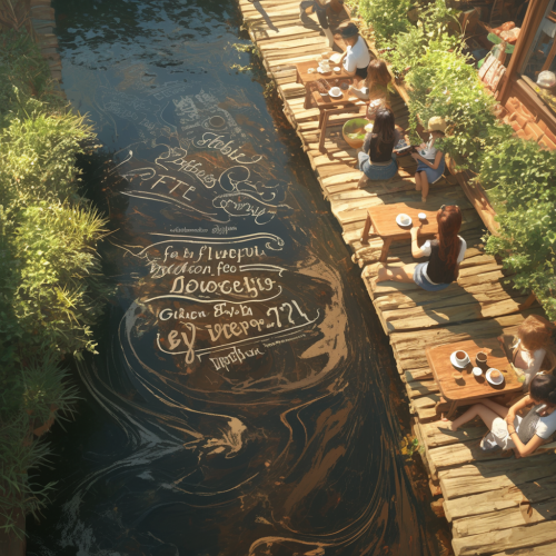 a painting of de Gerhardz numa cena em New York, zona rural em um final de tarde, pessoas em mesas conversando e tomando cafe, azul, terracota e verde cana. elétrica. árvores secas com galhos longos e secos. sombras das pessoas no chão são compridas. postes de luz antigo , in the style of holographic, rococo pastel colors, early computer art, transparent/translucent medium, decorative relief, steinheil quinon 55mm f/1.9