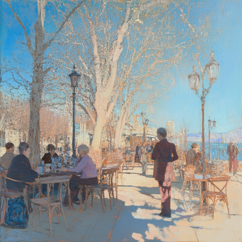 Pintura impressionista com tinta a oleo brilhosa de Gerhardz numa cena em New York, zona rural em um final de tarde, pessoas em mesas conversando e tomando cafe, azul, terracota e verde cana. elétrica. árvores secas com galhos longos e secos. sombras das pessoas no chão são compridas. postes de luz antigo