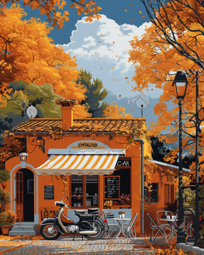 a high resolution cartoon style illustration of A small, roadside café with a vintage motorbike parked in front. The café's patio has metal chairs and tables, where locals sip coffee under an umbrella as the golden afternoon sun filters through the surrounding trees and lampposts , blue sky, white clouds, afternoon, rendered in a colorful cartoon style, with bright colors and clear lines , well detailed, colorful, eye pleasing --ar 4:5 --s 500 --v 6.0 --chaos 20