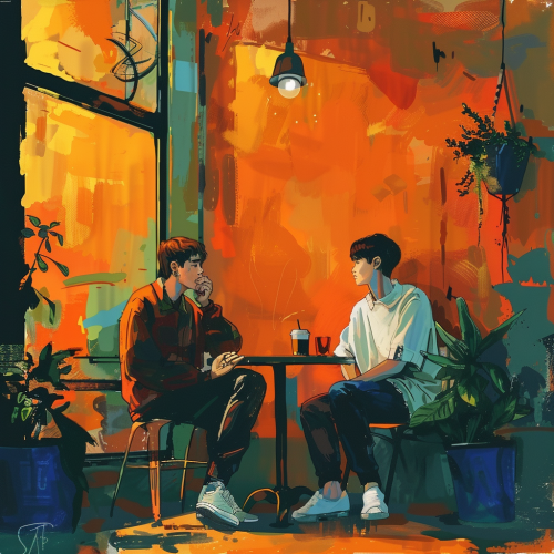 illustration, simple, cool. guy,,chatted with friend, time flew,