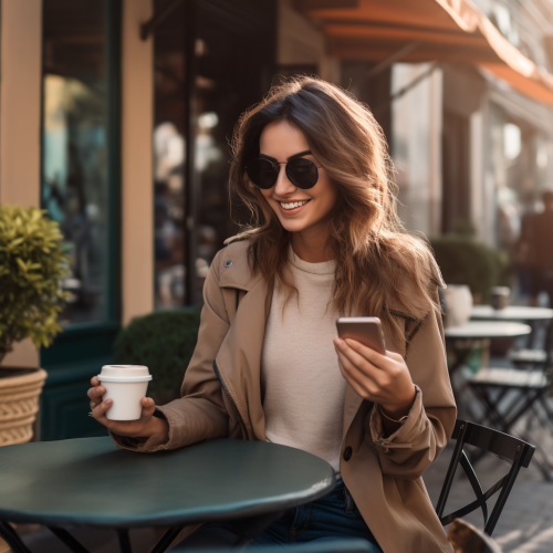 A realistic photo of a brunette sitting in a cafe in Amsterdam drinking coffee. She is wearing a pink blouse under a brown sweater and a pair of sunglasses. The camera angle is at 30 degrees.