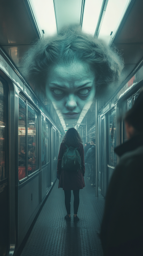 a woman with large head look obease, ugly and sick being overworked in subway coming back from work, surreal photo, foggy atmosphere, higly detailed picture --ar 9:16