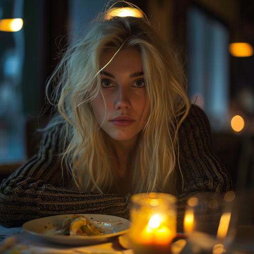 early autumn evening in a small town, a sickly woman with a grayish pallor is being ushered out of a restaurant by the manager who is covering his mouth and nose with a cloth napkin, ultrarealistic, 8k, cinematic focus --ar 5:3