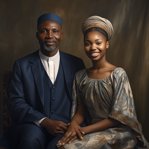 A hyper realistic picture of An African man sitting on a chair and his grown up daughter standing,wearing an african wedding atire and facing the camera v 5.2