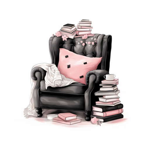 Digital Illustration, cosy chair with pile of books, black pink gray, procreate, white background