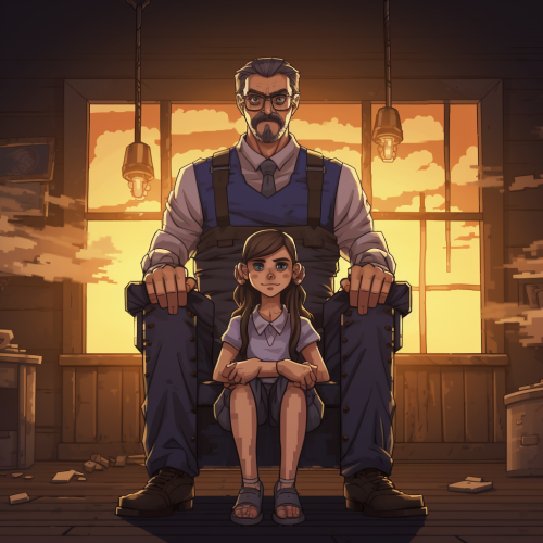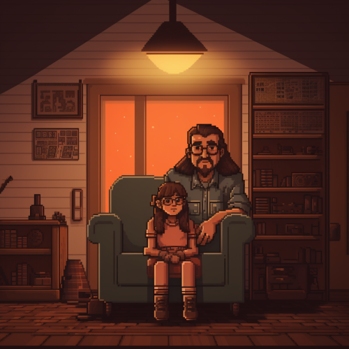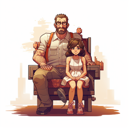 4-bit pixel arts style, retro game style, retro horror game style, A family photo featuring a dad and his daughter. The daughter is seated on a wooden chair, and the dad has his hand resting on her shoulder. white color background, The dad is a middle-aged man in his 50s, and the daughter is a teenage girl like 17,18