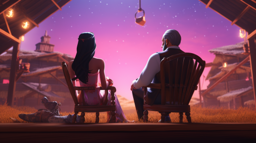 old fortnite man sitting in chair watching daughter dancing, barn background, 3d render, fortnite art style, --ar 16:9