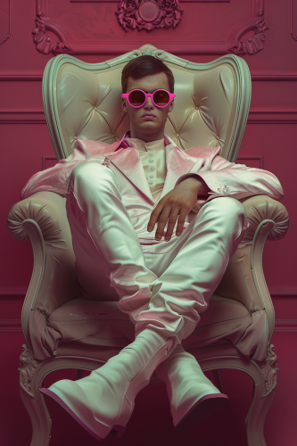 a man wearing pink sunglasses sits in a chair, in the style of natalie shau, zbrush, matti suuronen, mike campau, exotic, sculpted, bold color usage --ar 2:3 --v 6.0