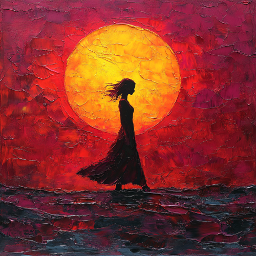 A silhouette of a girl walking against the backdrop of a vibrant sunset. The glowing sun is large and intense, casting deep reds, oranges, and purples across the sky. The girl’s body is shadowed, creating an abstract and atmospheric effect, blending into the sunset. The scene feels warm and mysterious, with a focus on the sun’s powerful glow. --s 750