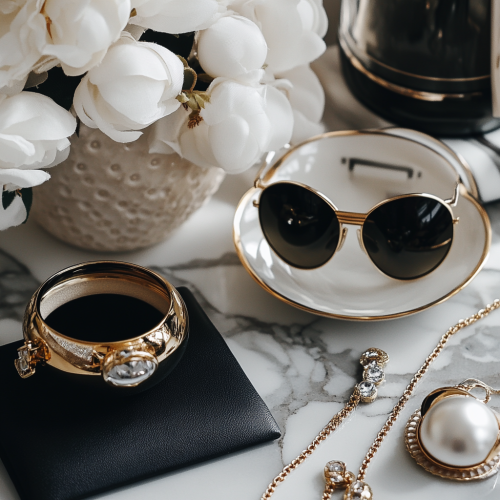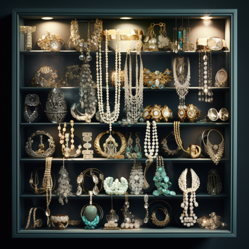 showcase of a collection of a woman's modern luxury jewelry items. mostly consists of diamonds. these are stored inside a jewelry glass cabinet. ar 16:9