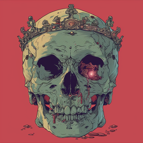 vector design, Pose: A silvery embossed outline shows Jack standing tall and regal. Instead of his standard suit, he dons a robe with silver Gothic patterns that blend into the shirt's darkness, creating an effect where the robe seems to merge with the shadows. Face: Jack's characteristic skull face is captured with silver lines, but his eyes, deeper and more profound, stand out starkly against the black. A single teardrop-shaped shadow is visible beneath one eye, representing his inner melancholy. Crown: A tarnished, silver crown sits atop his head. The deep red jewels on the crown provide the only splash of color, glowing subtly against the monochromatic palette. Hands: One of Jack's skeletal hands, outlined in silver, holds a staff with a crystal orb. Within the orb, a dimly lit haunted town silhouette can be discerned. His other hand, outstretched, has a faint outline of a raven, its eyes another hint of deep red. Backdrop: The backdrop, barely discernible against the black t-shirt but catching light with a slight sheen, features ghostly silhouettes of tombstones and barren trees. Ethereal apparitions, also in silver, seem to float and encircle Jack, giving him an otherworldly aura. Details: From the bottom of the design, slightly shimmering silver hands appear to rise, trying to reach out towards Jack, highlighting the underworld's eternal tug. --s 200 --upbeta --ar 19:26 --no shadow