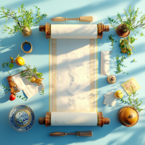 A wide, highly realistic image of a Simchat Torah holiday setup featuring a top-down view in natural daylight. The Torah scrolls, Hanukkah Menorah . The background is a light blue, creating a clean and fresh look under bright sunlight. The focus is on the symbolic elements of the Simchat Torah, with vibrant colors and natural shadows, giving the scene a more realistic, photographic appearance with the feel of a sunny day.