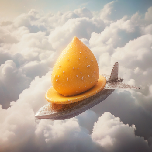 A realistic yellow modak sitting on a flying airplane, crisp detailing, vibrant colors, dynamic perspective, soft cloud background, natural light --ar 1:1 --s 150 --no text