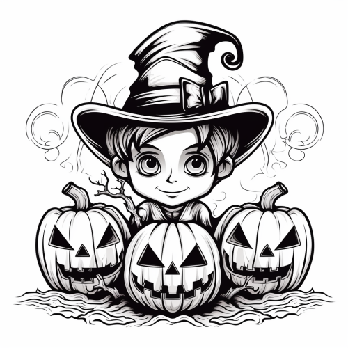 halloween themed coloring page, coloring book for kids, simple outline and shapes, white background, black and white, no shades, cartoon style