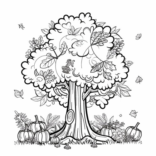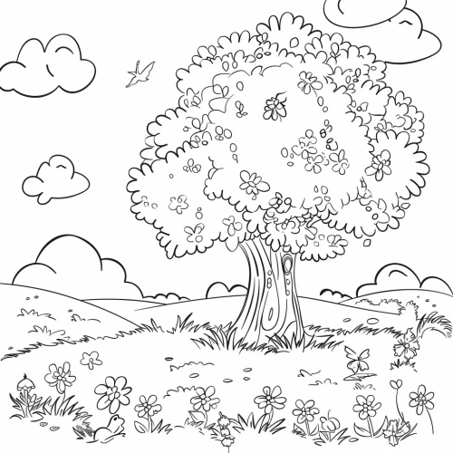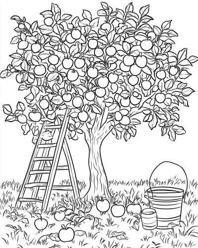 coloring page for kids, apple tree with apples bucket and a ladder, apple picking scene, minimalist, thick line, low detail, no shading --ar 4:5 --v 6.1 --style raw