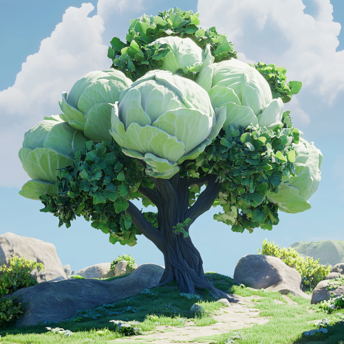video game tree with huge cabbages on it The style embraces simplicity and consists only of geometrical shapes A lot of focus is put into shapes, materials, and lighting to make up for the absence of textures