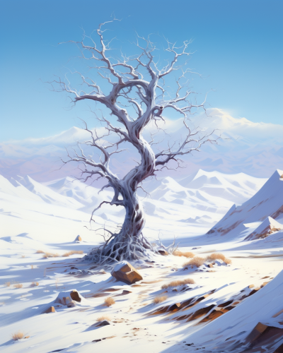Andreas Rocha simple optimistic fantasy anime realistic illustration of a frozen snow tree, in the middle of endless desert dune, painted by John Avon and David Brayne. --ar 4:5