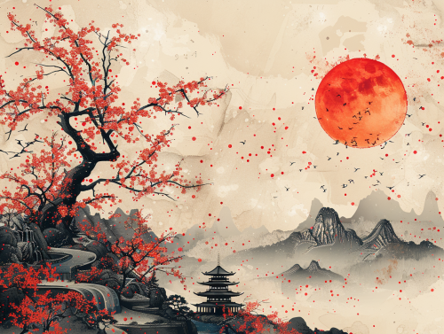japanese ink, flat vector art illustration of a cherry blossom tree --ar 4:3 --v 6.0 --s 750 --style raw