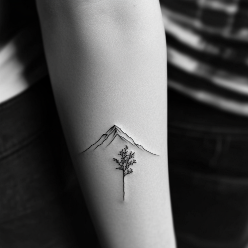 A minimalist tattoo design of a mountain with clean lines, representing stability and strength. At the base of the mountain, add a small, delicate flower or tree, symbolizing sensitivity and inner kindness. The overall design should be simple, elegant, and balanced, with a focus on the contrast between the strong mountain and the gentle nature element. Black ink only.