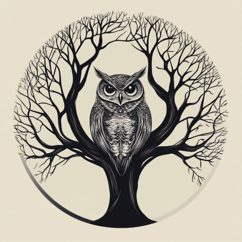 Minimalistic vector illustration of an owl integrated into a tree, with smooth, flowing lines forming both the branches and the owl itself. The style is clean, symmetrical, and features a simple color palette with a single tone. The overall composition is harmonious, with the owl centrally placed within the circular shape of the tree