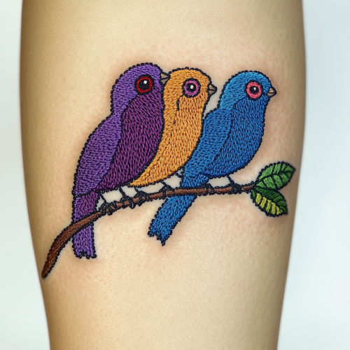 create a tattoo in the style of embroidery of 3 indian ringneck birds - on a branch. one is a dual factor purple male, one is a blue male and the other is a blue female.