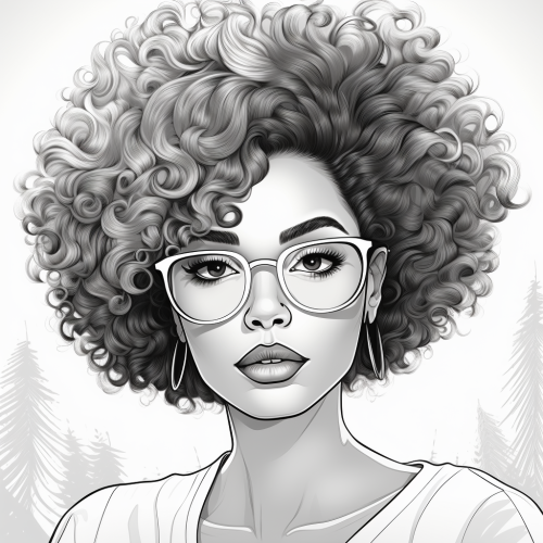 generate a simple coloring book, large print, for teens, featuring a african american woman with sunglasses, simple, no grey, no shadow, make hair white, bold lines.