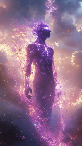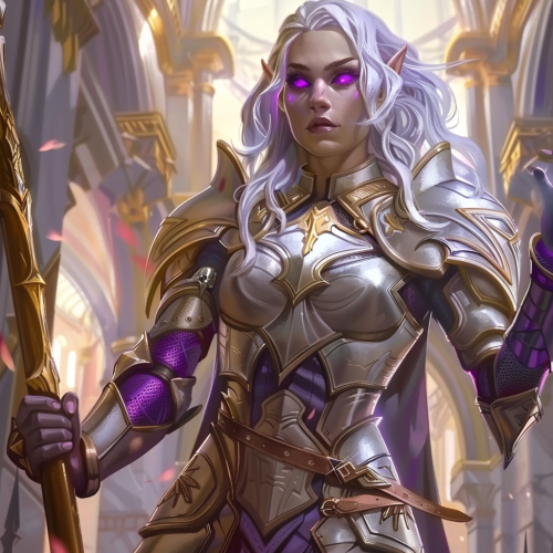 Dungeons and Dragons Artstyle, female elf with purple eyes, cleric, gleaming silver armor, golden lance, divine magic, soft features