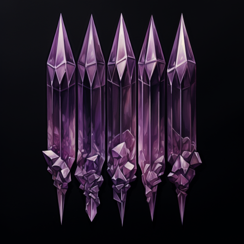 A tattoo design featuring five large, hyper-realistic, elongated amethyst crystal tips arranged in a ray-like pattern, emphasizing isolation, magic, mysticism, Wiccan symbolism, witchy aesthetics, and a strong emphasis on high color contrast --s 50