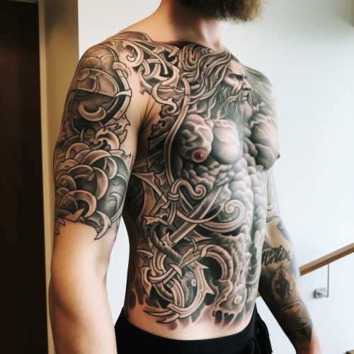 Full arm sleeve tattoo of the Second Coming of the Lord Jesus Christ, Son of Man. Revealed, Days of Noah, Fire behind, Lightning, Earthquakes, Armageddon, Portrait of Christ, Eyes of Flaming Fire, Lion of Judah, Universe, 16K, --chaos 32 --ar 8:3 --s 1000 --v 6.0