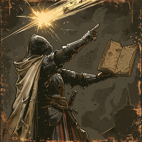 a knight raising pointing to the sky, bathed in a ray of light, golden scripture as if receiving a divine message, rpg spell icon, magic ability, spell effect, gritty, hand drawn, dramatic lighting, illustration, magic ability icon, magic effect --v 6.0