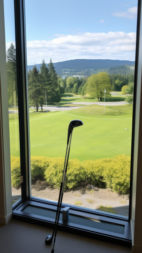a screenshot of a 3D video game that displays the interior of a fun club house with a golf theme, the carpet is green astroturf. There are 4 avatars in the room, 2 male and 2 female, each dressed with individual styles. The space is furnished with upscale modern design furnishings, and lighting is bright and festive. Art style is like a modern realistic PC 3D video game. The avatars appear to be chatting with each other. On the walls there are pictures of the avatars playing golf. On one wall there is an exit door. --ar 16:9 --v 6.0