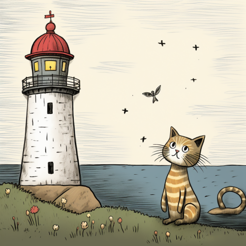 a simple illustraion for a storybook about a cat and a lighthouse, naive art