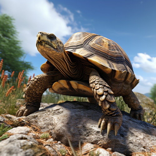 A hyper-realistic version of a tortoise with a mystical appearance. The tortoise has a large, detailed shell with glowing runes etched into each segment, resembling ancient symbols. The shell glows with a bright, luminescent blue hue that contrasts with the tortoise's dark blue skin, which is speckled with lighter blue spots. The tortoise's expression is stoic and wise, with realistic textures on its skin, showing scales and wrinkles typical of a tortoise. Its legs are strong and sturdy, with each toe clearly defined. The background is simple, allowing the tortoise to stand out as the main subject.