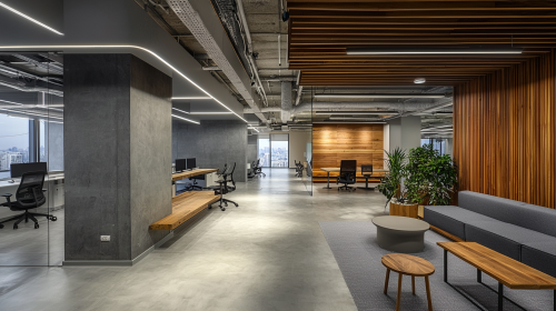 A sleek, modern office space with minimalist furniture and metal paneling, showcasing the latest in contemporary workspace design trends. The open floor plan features a neutral color palette with beige and grey tones, creating a sophisticated and calming environment. The client desk, accompanied by chairs and two MacBooks on the table, is central to the design, while the metal paneling adds a modern industrial aesthetic. The space feels open and airy, with high-end minimalist furniture enhancing its functional yet stylish atmosphere. Large floor-to-ceiling windows allow natural lighting to flood the room, emphasizing the sleek, professional tone. Photographed in the style of architectural photography typical of Shutterstock, Getty Images, or Unsplash, the image captures the essence of contemporary office design. --ar 16:9 --q 2 --style raw --v 6.1 --s 50