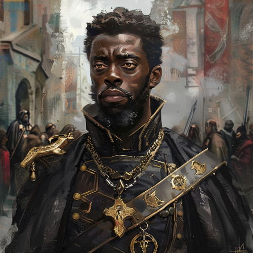 Age of Sigmar, portrait of Chadwick Boseman as Black Priest of Sigmar in rugged clothing, warhammer fantasy, background in mediaval slums, art style of Johan Grenier --v 6.0