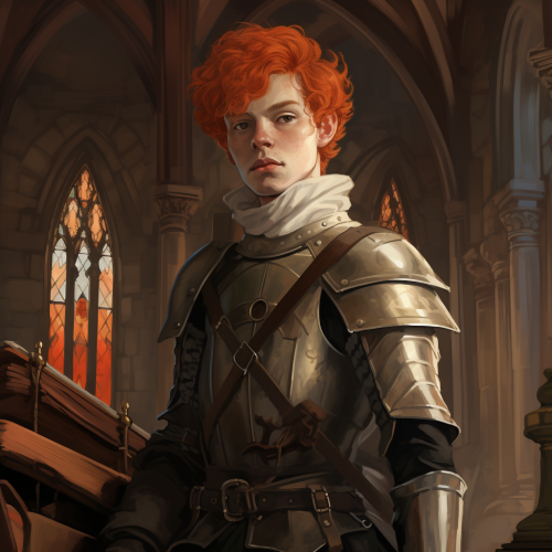 cartoonish illustration of redheaded priest with crossbow and leather armour, young and scared, pale