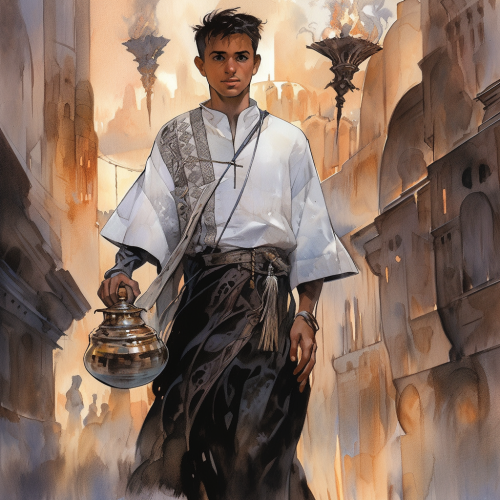 close-up, male filipino pinoy priest walking through lalibela, holding a smoldering censer, inspired by kj apa tom daley adam rippon, colored inks style, style of luis royo, leonid afremov, mike zeck, edgard maxence, mondrian --niji 5