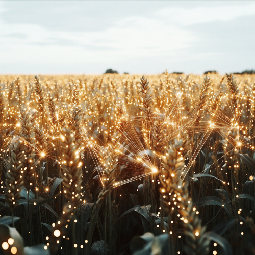 A whimsical illustration of a sweet girl with blushing cheeks. 2 cuckoos, brown hair, big green eyes, a beautiful girlish dress, standing in a wheat field and picking wheat in the background, a small dreamy, beautiful country house with a tree in the garden with purple, red and blue leaves at dusk. A stunning children's book style dreamy illustration