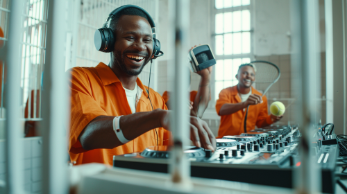 a photograph of a prisoner dj'ing in a white prison cell, he is using CDJ 2000 decks, wearing headphones and smiling, there are 2 prisoners in the cell with him, watching him DJ, one prisoner is holding a tennis ball, all prisoners are wearing orange jump suits, photorealistic, ultra HD, 4k --v 6.0 --ar 16:9