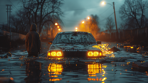 A car sinking in the water with its lights ON while a person with a hood on watches it sink in the middle of the night. ultra realistic photography 64K resolution, extreme high detail. --style raw --s 750 --ar 16:9 --v 6.0