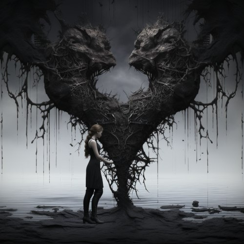 amature 1980s rural council estate photography in style of Kimmo Ojaniemi, ominous and serene evening shot, low wintersun, thick black smoke all over, tall dark looming postmodern designed reinforced concrete surreal animal and plant statues, drizzle rain, multple creative angles, full portraits of melcholic sisters dancing around simple stone animal heads, they are wearing outfits that is a mix of 70s folk horror and 90s rave attire, realistic skin tone, blushed skin, --no deformed limbs --chaos 20 --style raw --stylize 30 --weird 4 --v 6.1