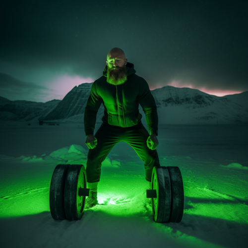 a bald, bearded, icelandic man deadlifting 10000 kilograms at the foot of an icy mountain, with the northern lights overhead, emphasise the pain in his face --v 5.0