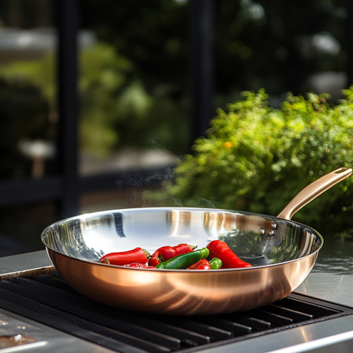 Eine Kupferpfanne die außen komplett aus Kupfer besteht außer der Griff der ist aus Edelstahl die Pfanne hat einen leichten Matten Effekt. Viel Tageslicht Grill draußen. Eine typische Werbung für eine große Pfannenmarke. Hauptfokus auf die Pfanne Aufgenommen mit einer Sony Alpha 7R V aus 2 Metern Entfernung